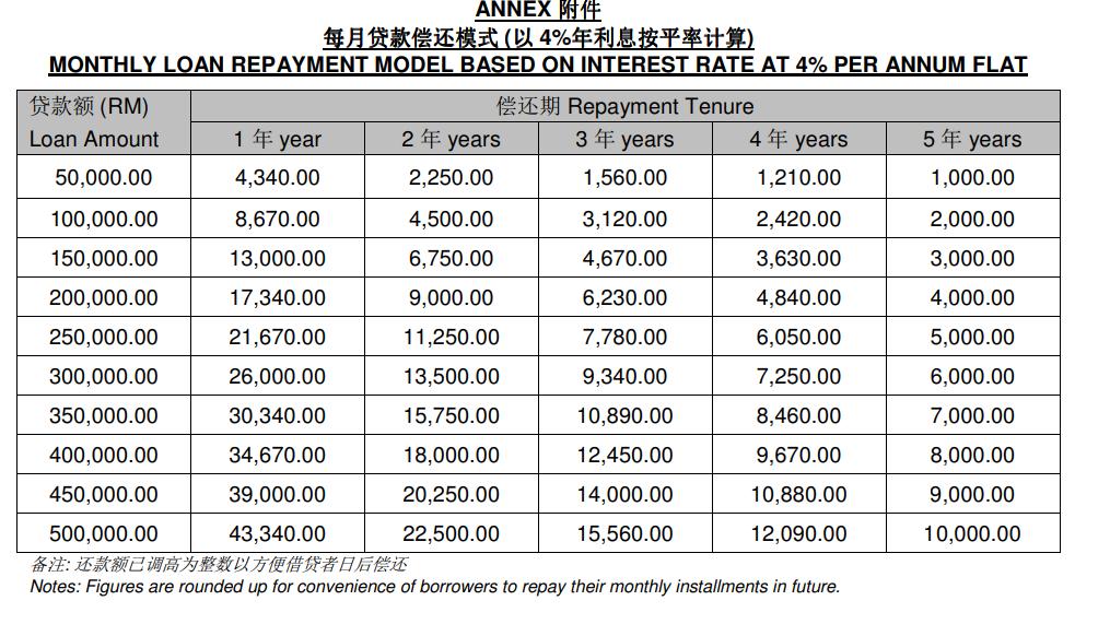 4% kadar faedah rata setahun dengan ansuran bulanan tetap (seperti yang ditunjukkan dalam jadual yang diberikan)